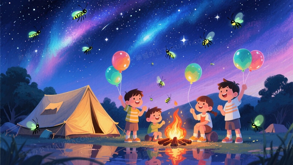 星空露营主题卡通图围着篝火的孩童放飞萤火虫气球
