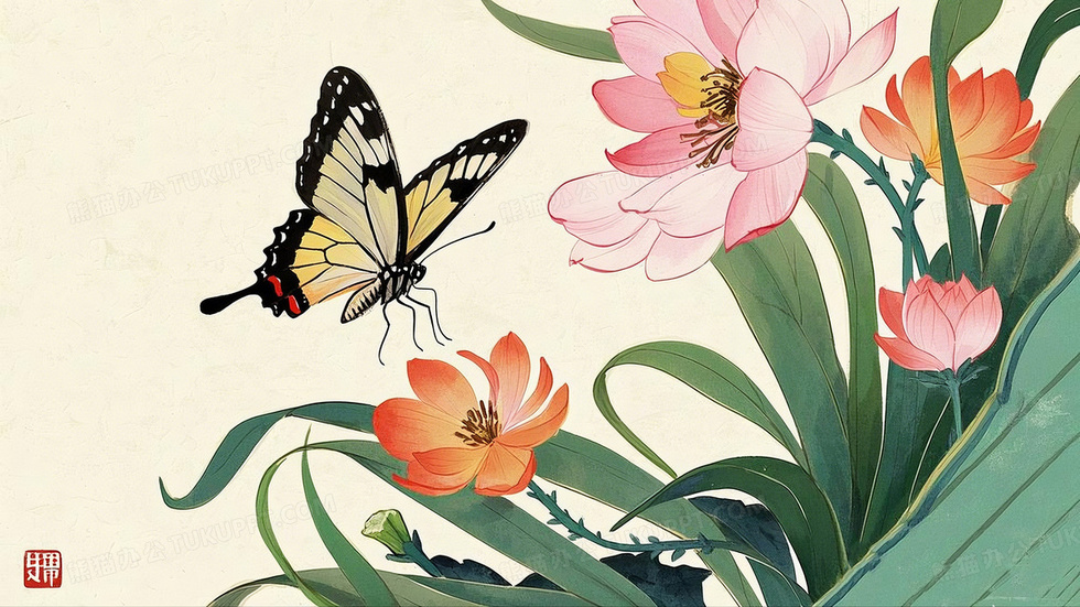 本作品内容为中国水墨风蝴蝶花朵唯美场景插画, 格式为 jpg, 大小3 MB, 图片尺寸为2720 x 1530, 源文件无水印, 欢迎使用熊猫办公。 如认为平台内容涉嫌侵权,可通过邮件:tousu@tukuppt.com提出书面通知,我们将及时处理。