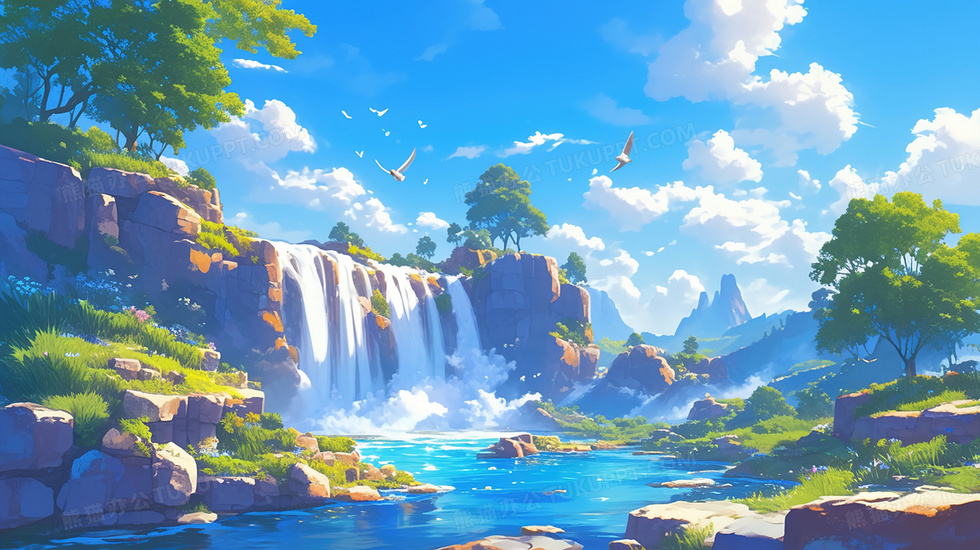 本作品内容为唯美大自然瀑布景色天空云层插画, 格式为 jpg, 大小3 MB, 图片尺寸为2912 x 1632, 源文件无水印, 欢迎使用熊猫办公。 如认为平台内容涉嫌侵权,可通过邮件:tousu@tukuppt.com提出书面通知,我们将及时处理。