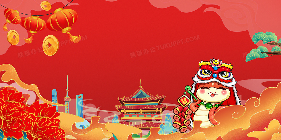 本作品内容为蛇年春节节日合成背景, 格式为 psd, 大小64 MB, 图片尺寸为4722 x 2361, 作品中背景图片无需修改, 源文件无水印,可以直接使用, 欢迎使用熊猫办公。 如认为平台内容涉嫌侵权,可通过邮件:tousu@tukuppt.com提出书面通知,我们将及时处理。