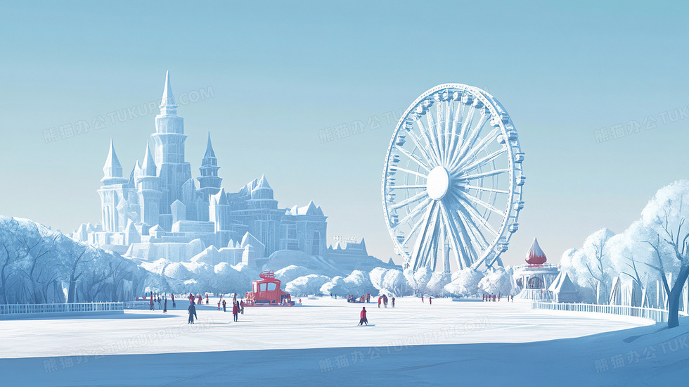 本作品内容为冰雪摩天轮城堡雪景插画, 格式为 jpg, 大小3 MB, 图片尺寸为2912 x 1632, 源文件无水印, 欢迎使用熊猫办公。 如认为平台内容涉嫌侵权,可通过邮件:tousu@tukuppt.com提出书面通知,我们将及时处理。