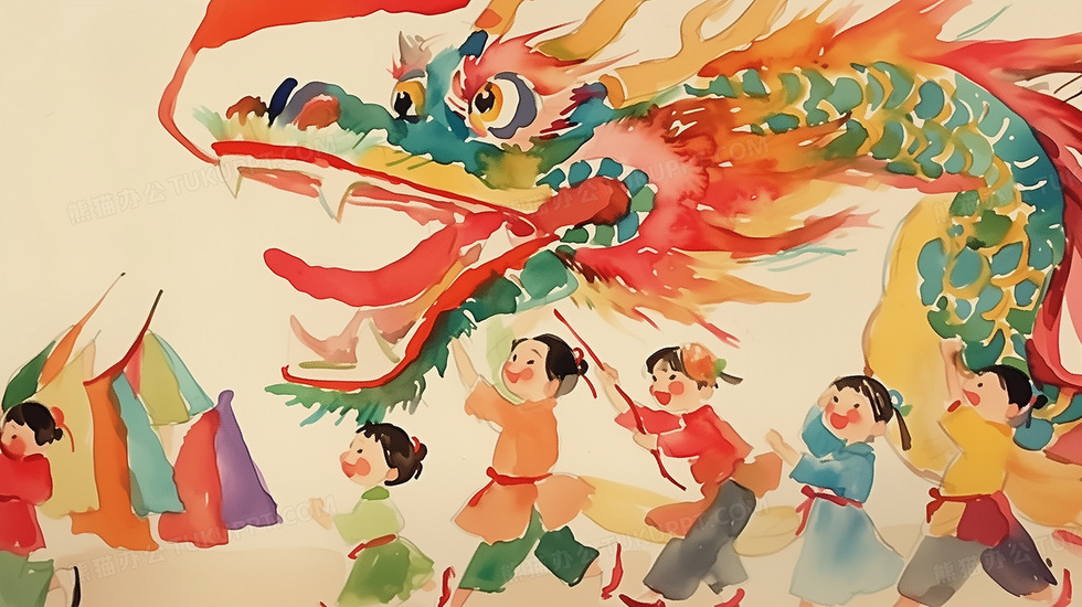 本作品内容为孩子们在参与热闹的舞龙表演插画, 格式为 jpg, 大小6 MB, 图片尺寸为2912 x 1632, 源文件无水印, 欢迎使用熊猫办公。 如认为平台内容涉嫌侵权,可通过邮件:tousu@tukuppt.com提出书面通知,我们将及时处理。