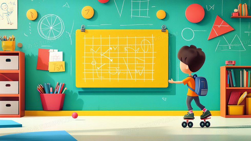 本作品内容为一个学生踩着滑轮黑板前卡通插画, 格式为 jpg, 大小3 MB, 图片尺寸为2912 x 1632, 源文件无水印, 欢迎使用熊猫办公。 如认为平台内容涉嫌侵权,可通过邮件:tousu@tukuppt.com提出书面通知,我们将及时处理。