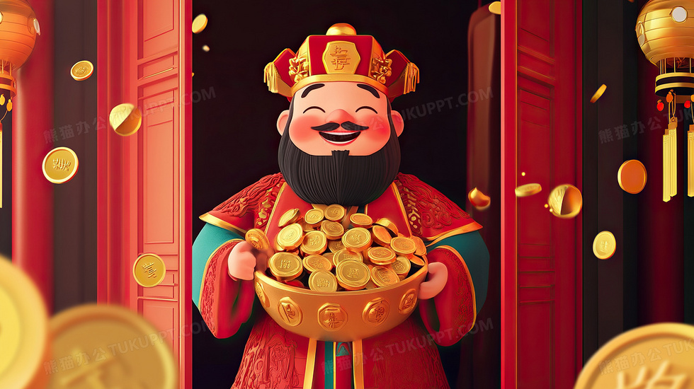 本作品内容为红色卡通风财神爷手拿一盆金币插画, 格式为 jpg, 大小3 MB, 图片尺寸为2912 x 1632, 源文件无水印, 欢迎使用熊猫办公。 如认为平台内容涉嫌侵权,可通过邮件:tousu@tukuppt.com提出书面通知,我们将及时处理。