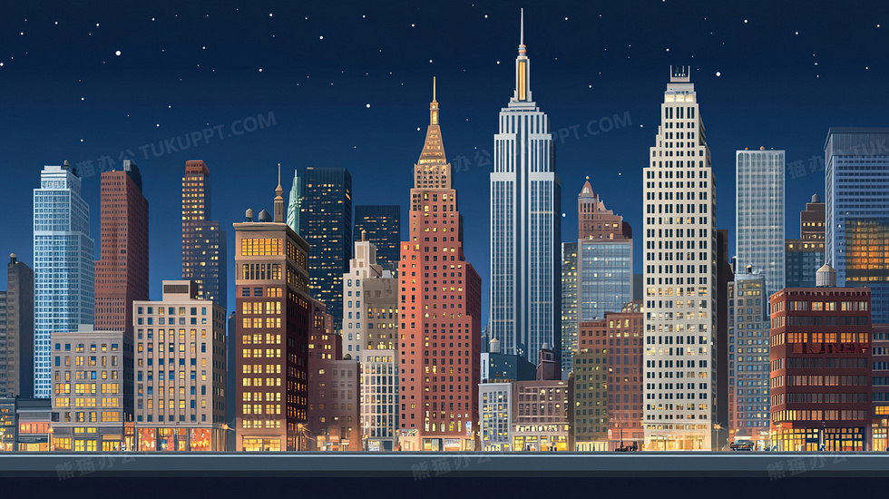 本作品内容为夜晚亮灯的城市高楼大厦插画, 格式为 jpg, 大小4 MB, 图片尺寸为2912 x 1632, 源文件无水印, 欢迎使用熊猫办公。 如认为平台内容涉嫌侵权,可通过邮件:tousu@tukuppt.com提出书面通知,我们将及时处理。