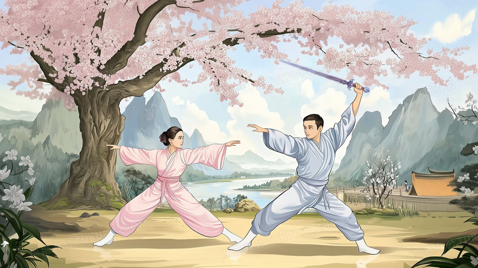 本作品内容为身着中国传统服装的青年男女在樱花掩映下练习太极插画, 格式为 jpg, 大小8 MB, 图片尺寸为2912 x 1632, 源文件无水印, 欢迎使用熊猫办公。 如认为平台内容涉嫌侵权,可通过邮件:tousu@tukuppt.com提出书面通知,我们将及时处理。