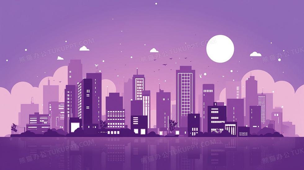 本作品内容为紫色城市建筑剪影远景现代风光建筑插画, 格式为 jpg, 大小2 MB, 图片尺寸为2912 x 1632, 源文件无水印, 欢迎使用熊猫办公。 如认为平台内容涉嫌侵权,可通过邮件:tousu@tukuppt.com提出书面通知,我们将及时处理。