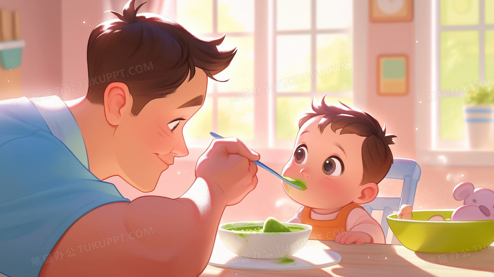 本作品内容为爸爸在厨房给宝宝喂饭卡通插画, 格式为 jpg, 大小2 MB, 图片尺寸为2912 x 1632, 源文件无水印, 欢迎使用熊猫办公。 如认为平台内容涉嫌侵权,可通过邮件:tousu@tukuppt.com提出书面通知,我们将及时处理。