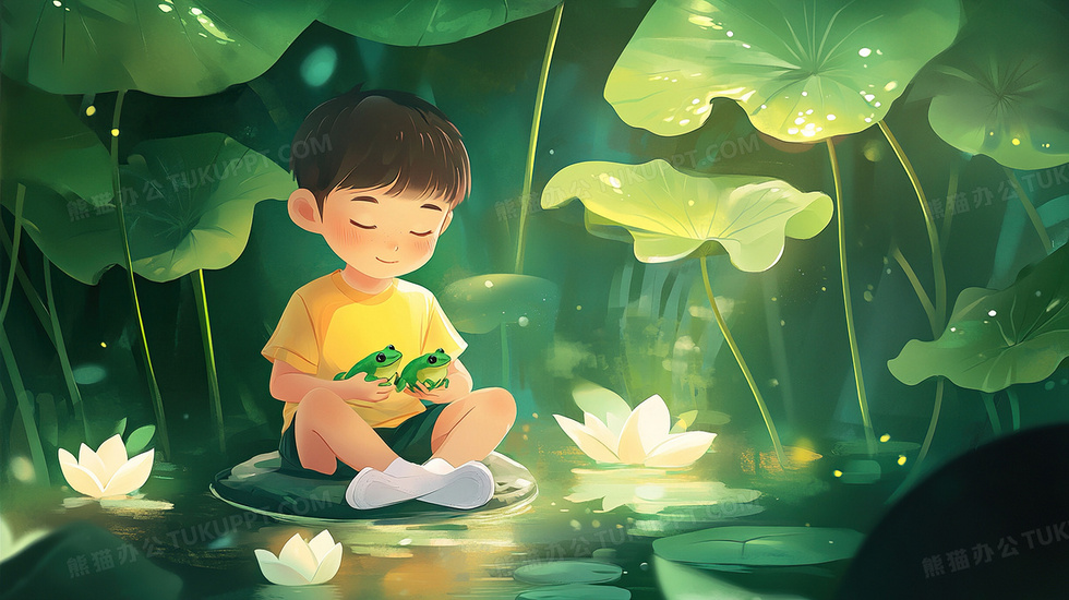 本作品内容为荷花男孩青蛙夏天唯美风景插画, 格式为 jpg, 大小3 MB, 图片尺寸为2912 x 1632, 源文件无水印, 欢迎使用熊猫办公。 如认为平台内容涉嫌侵权,可通过邮件:tousu@tukuppt.com提出书面通知,我们将及时处理。