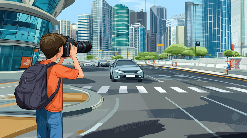 本作品内容为城市街头拿着相机拍照的男孩插画, 格式为 jpg, 大小3 MB, 图片尺寸为2912 x 1632, 源文件无水印, 欢迎使用熊猫办公。 如认为平台内容涉嫌侵权,可通过邮件:tousu@tukuppt.com提出书面通知,我们将及时处理。