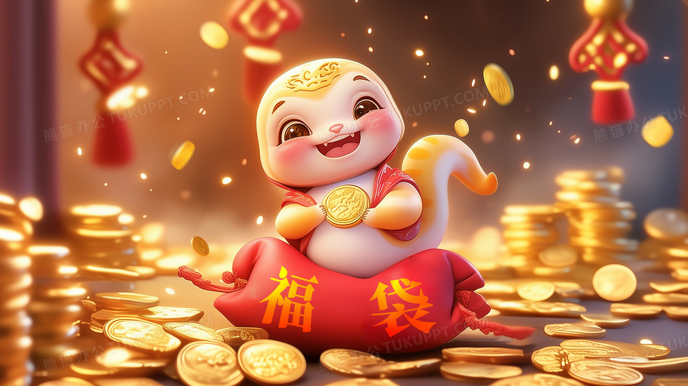 本作品内容为一条坐在红色福袋上的卡通蛇插画, 格式为 jpg, 大小5 MB, 图片尺寸为2912 x 1632, 源文件无水印, 欢迎使用熊猫办公。 如认为平台内容涉嫌侵权,可通过邮件:tousu@tukuppt.com提出书面通知,我们将及时处理。