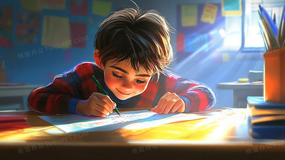 本作品内容为课外辅导班兴趣班学习写作的卡通男孩插画, 格式为 jpg, 大小3 MB, 图片尺寸为2912 x 1632, 源文件无水印, 欢迎使用熊猫办公。 如认为平台内容涉嫌侵权,可通过邮件:tousu@tukuppt.com提出书面通知,我们将及时处理。