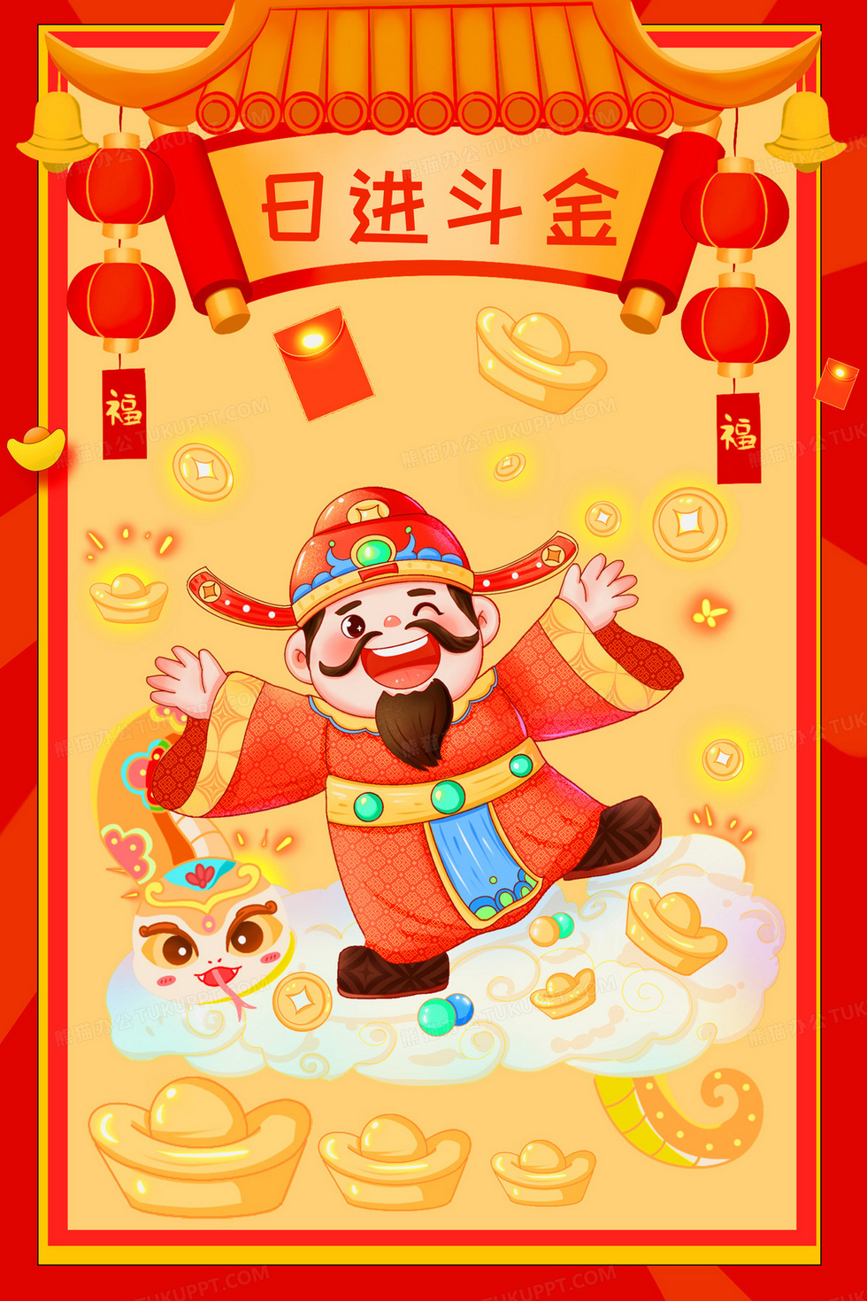 本作品内容为蛇年财神爷日进斗金竖版插画, 格式为 psd, 大小52 MB, 请使用软件PhotoShop(CC)打开, 源文件无水印, 欢迎使用熊猫办公。 如认为平台内容涉嫌侵权,可通过邮件:tousu@tukuppt.com提出书面通知,我们将及时处理。