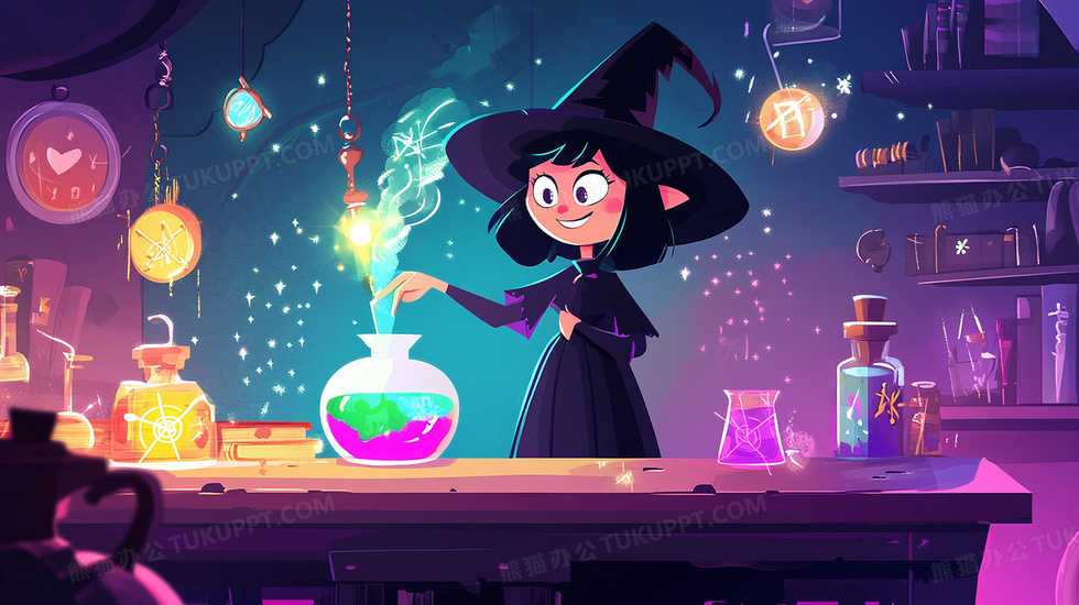 本作品内容为研制魔法药水的魔女插画, 格式为 jpg, 大小5 MB, 图片尺寸为2912 x 1632, 源文件无水印, 欢迎使用熊猫办公。 如认为平台内容涉嫌侵权,可通过邮件:tousu@tukuppt.com提出书面通知,我们将及时处理。