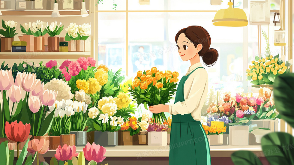 本作品内容为花店里整理鲜花的女孩插画, 格式为 jpg, 大小3 MB, 图片尺寸为2912 x 1632, 源文件无水印, 欢迎使用熊猫办公。 如认为平台内容涉嫌侵权,可通过邮件:tousu@tukuppt.com提出书面通知,我们将及时处理。