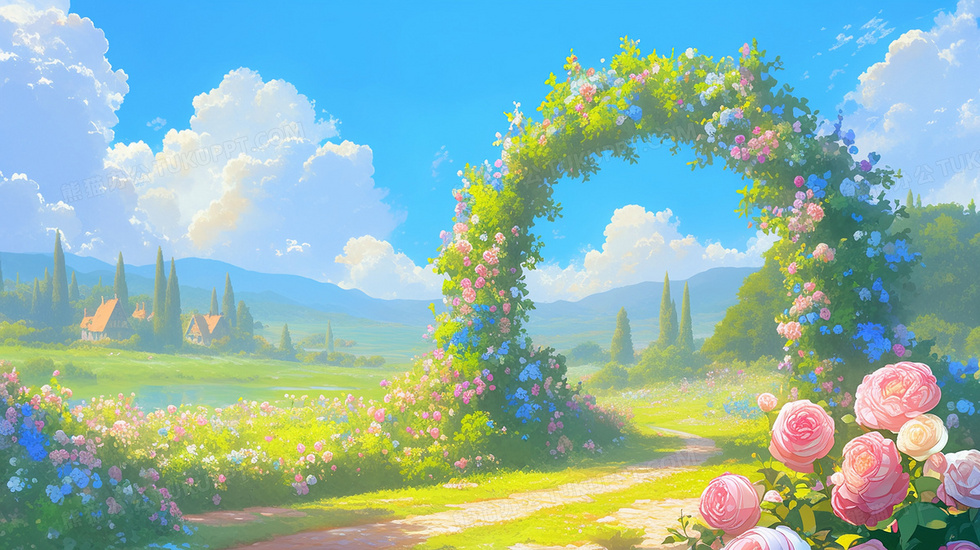 本作品内容为大自然乡间道路唯美弧形花卉装饰插画, 格式为 jpg, 大小3 MB, 图片尺寸为2912 x 1632, 源文件无水印, 欢迎使用熊猫办公。 如认为平台内容涉嫌侵权,可通过邮件:tousu@tukuppt.com提出书面通知,我们将及时处理。