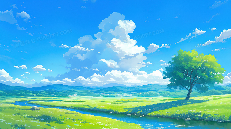 本作品内容为春天草地蓝天白云大自然风景插画, 格式为 jpg, 大小4 MB, 图片尺寸为2912 x 1632, 源文件无水印, 欢迎使用熊猫办公。 如认为平台内容涉嫌侵权,可通过邮件:tousu@tukuppt.com提出书面通知,我们将及时处理。