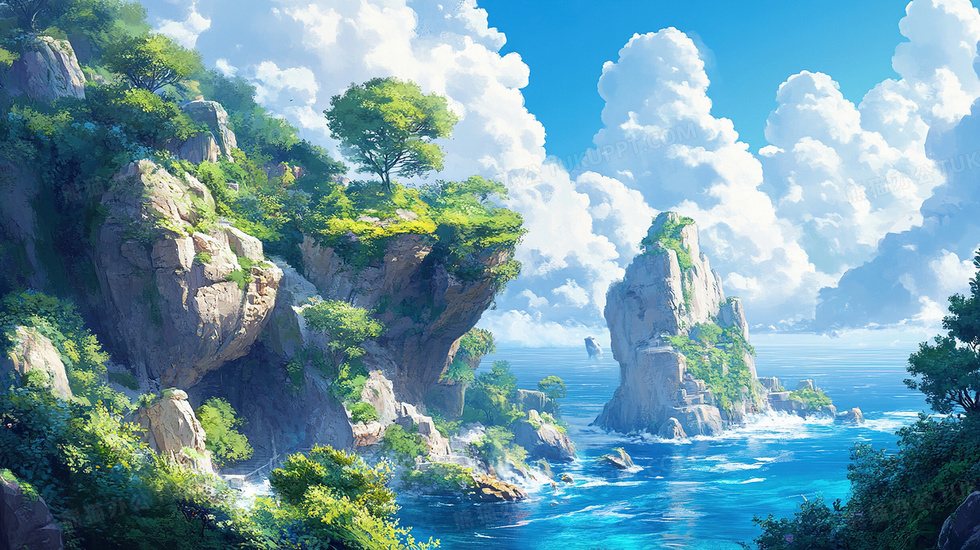 本作品内容为海洋岛礁自然风景插画, 格式为 jpg, 大小4 MB, 图片尺寸为2912 x 1632, 源文件无水印, 欢迎使用熊猫办公。 如认为平台内容涉嫌侵权,可通过邮件:tousu@tukuppt.com提出书面通知,我们将及时处理。