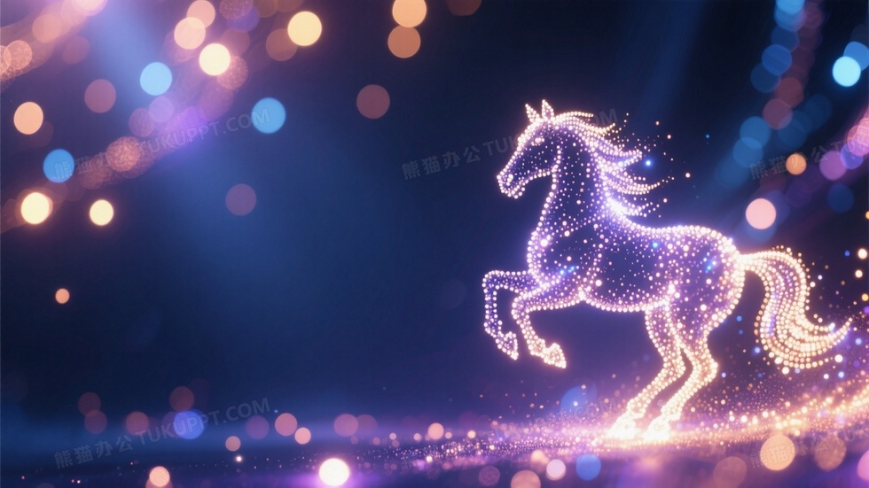 本作品内容为画面右下角是粒子光效组成的骏马形象, 格式为 jpg, 大小1 MB, 图片尺寸为1664 x 936, 作品中背景图片无需修改, 源文件无水印,可以直接使用, 欢迎使用熊猫办公。 如认为平台内容涉嫌侵权,可通过邮件:tousu@tukuppt.com提出书面通知,我们将及时处理。