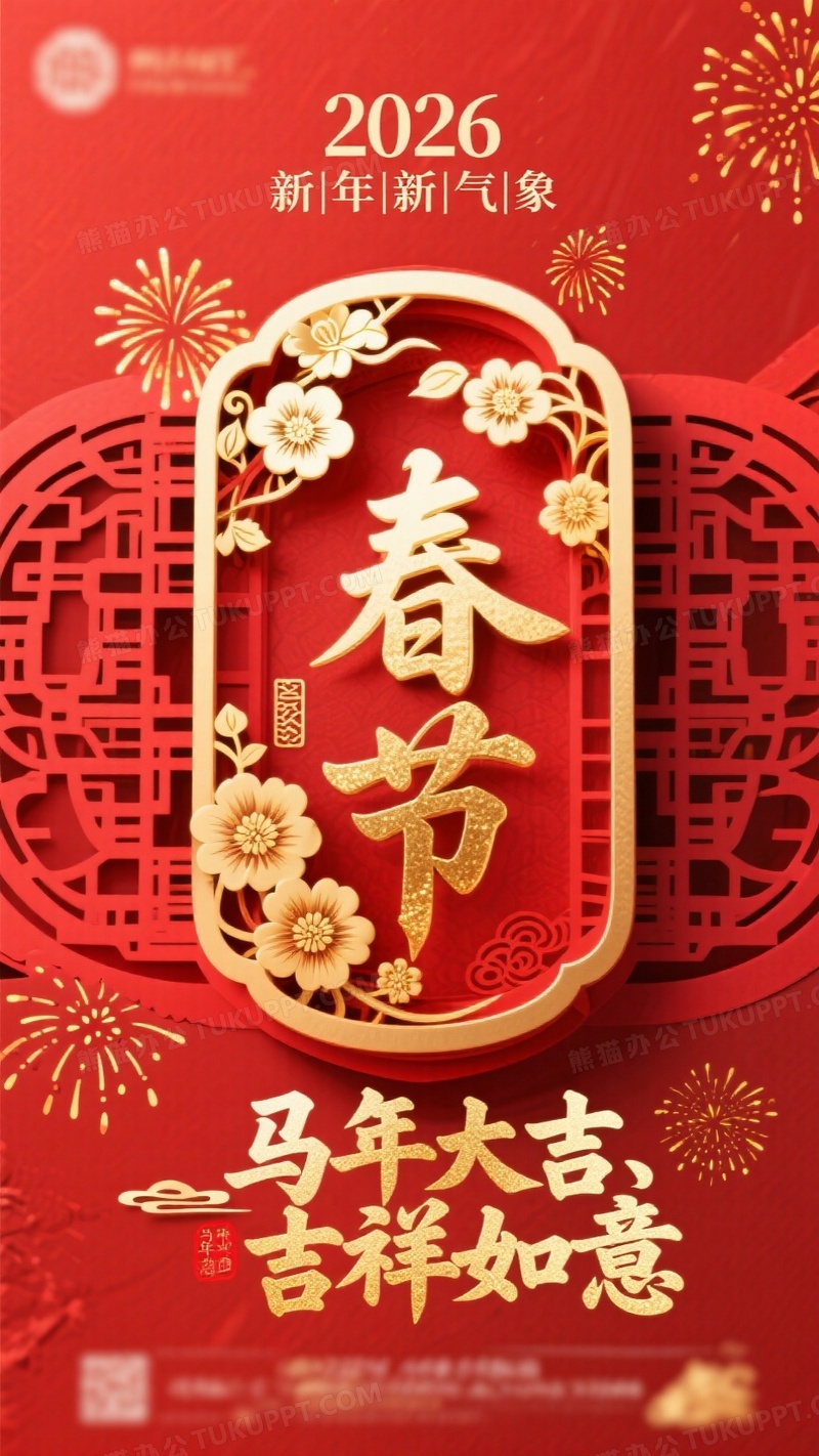 本作品内容为红色为背景的2026马年除夕主题海报, 格式为 jpg, 大小1 MB, 图片尺寸为936 x 1664, 源文件无水印, 欢迎使用熊猫办公。 如认为平台内容涉嫌侵权,可通过邮件:tousu@tukuppt.com提出书面通知,我们将及时处理。
