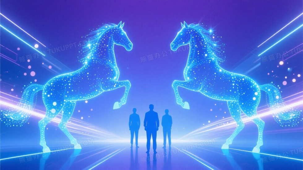 本作品内容为两侧是蓝色粒子骏马形象结合光效, 格式为 jpg, 大小1 MB, 图片尺寸为1664 x 936, 作品中背景图片无需修改, 源文件无水印,可以直接使用, 欢迎使用熊猫办公。 如认为平台内容涉嫌侵权,可通过邮件:tousu@tukuppt.com提出书面通知,我们将及时处理。