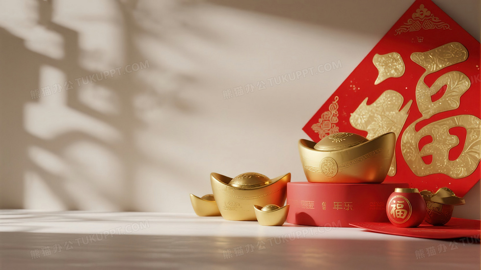 本作品内容为金元宝福字春节新年装饰场景简约背景图, 格式为 jpg, 大小5 MB, 图片尺寸为3328 x 1872, 作品中背景图片无需修改, 源文件无水印,可以直接使用, 欢迎使用熊猫办公。 如认为平台内容涉嫌侵权,可通过邮件:tousu@tukuppt.com提出书面通知,我们将及时处理。