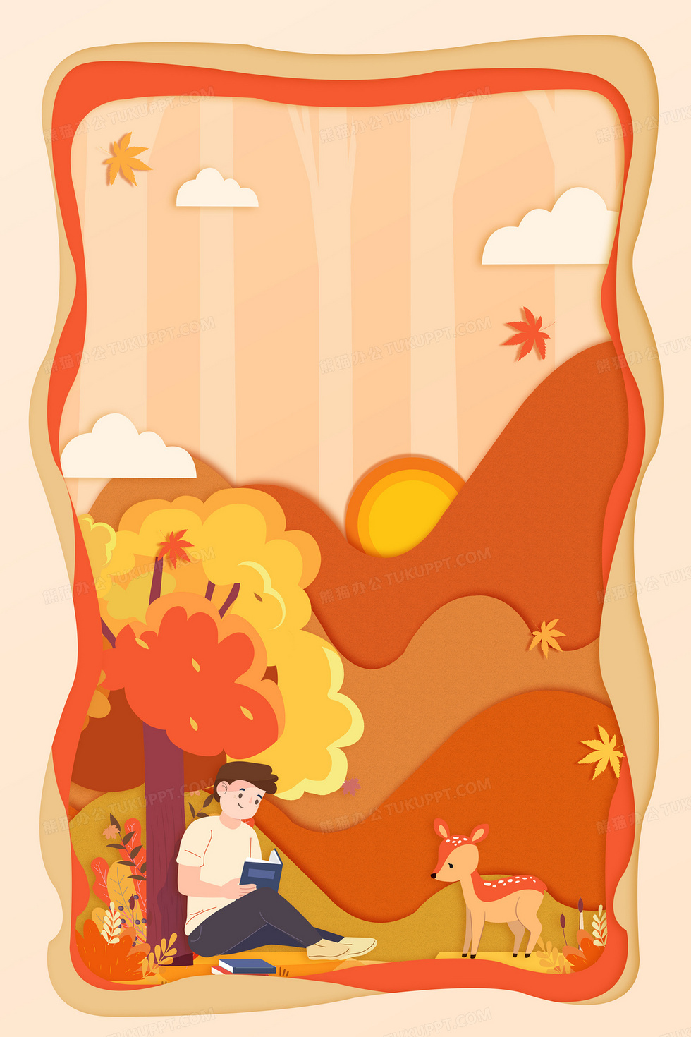 本作品内容为剪纸风秋天风景小鹿卡通立秋背景, 格式为 psd, 大小13 MB, 图片尺寸为3543 x 5315, 作品中背景图片无需修改, 源文件无水印,可以直接使用, 欢迎使用熊猫办公。 如认为平台内容涉嫌侵权,可通过邮件:tousu@tukuppt.com提出书面通知,我们将及时处理。