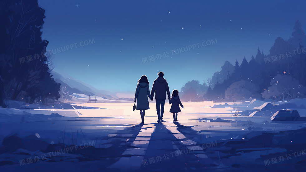 本作品内容为蓝色冬天雪景一家三口背影散步插画, 格式为 jpg, 大小6 MB, 图片尺寸为2912 x 1632, 源文件无水印, 欢迎使用熊猫办公。 如认为平台内容涉嫌侵权,可通过邮件:tousu@tukuppt.com提出书面通知,我们将及时处理。