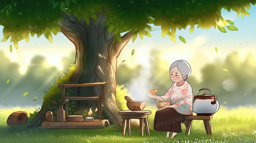 本作品内容为老奶奶坐在院子的火堆旁烧水煮茶创意插画, 格式为 jpg, 大小6 MB, 图片尺寸为2912 x 1632, 源文件无水印, 欢迎使用熊猫办公。 如认为平台内容涉嫌侵权,可通过邮件:tousu@tukuppt.com提出书面通知,我们将及时处理。