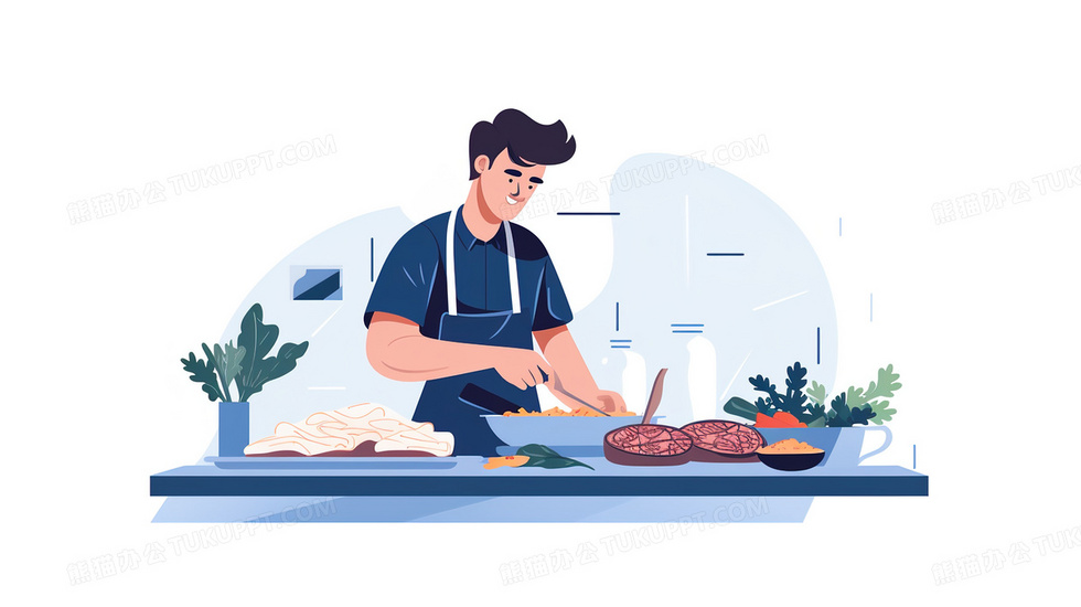 本作品内容为家庭主夫烹饪美食人物插画, 格式为 jpg, 大小3 MB, 图片尺寸为2912 x 1632, 源文件无水印, 欢迎使用熊猫办公。 如认为平台内容涉嫌侵权,可通过邮件:tousu@tukuppt.com提出书面通知,我们将及时处理。