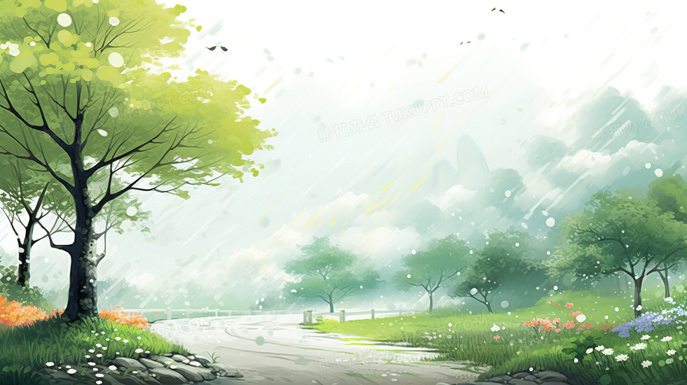 本作品内容为春天绿意盎然的草地树木风景插画, 格式为 jpg, 大小5 MB, 图片尺寸为2912 x 1632, 源文件无水印, 欢迎使用熊猫办公。 如认为平台内容涉嫌侵权,可通过邮件:tousu@tukuppt.com提出书面通知,我们将及时处理。