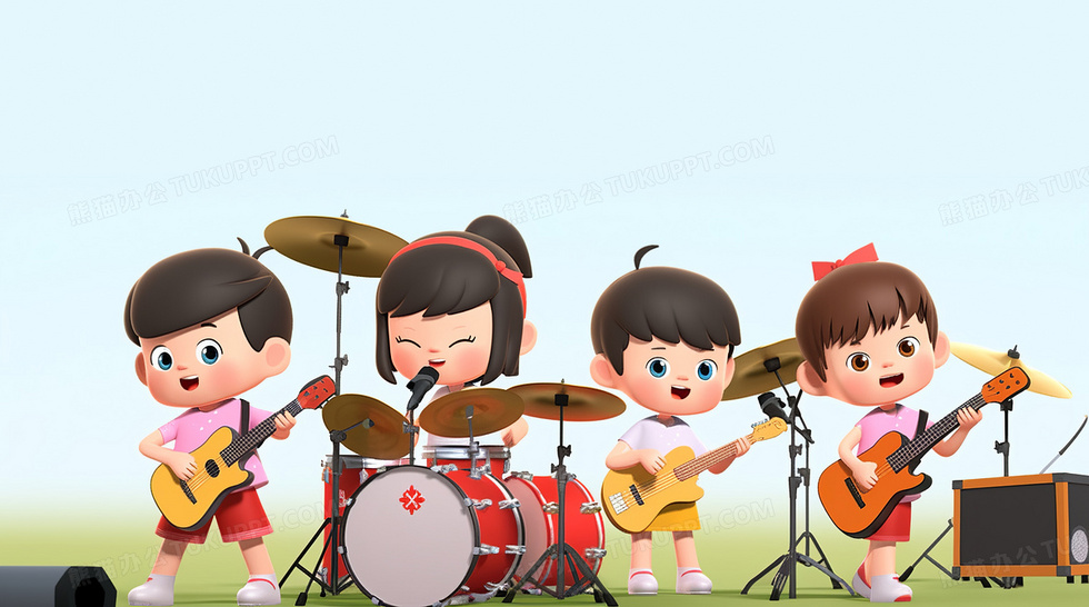 本作品内容为卡通可爱儿童乐队组合在表演节目创意插画, 格式为 jpg, 大小2 MB, 图片尺寸为2912 x 1624, 源文件无水印, 欢迎使用熊猫办公。 如认为平台内容涉嫌侵权,可通过邮件:tousu@tukuppt.com提出书面通知,我们将及时处理。