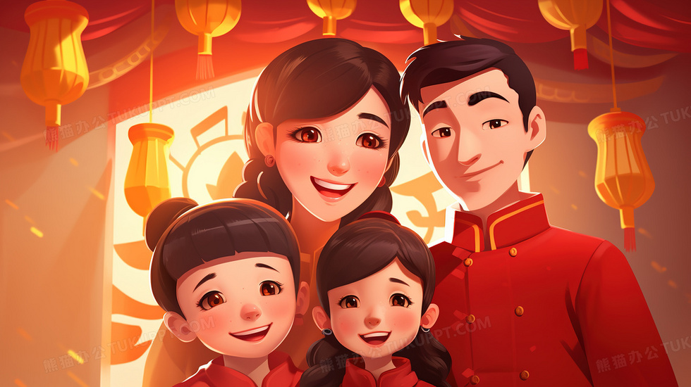 本作品内容为春节庆典里温馨的一家四口插画, 格式为 jpg, 大小5 MB, 图片尺寸为2912 x 1632, 源文件无水印, 欢迎使用熊猫办公。 如认为平台内容涉嫌侵权,可通过邮件:tousu@tukuppt.com提出书面通知,我们将及时处理。