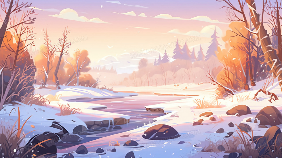 本作品内容为冬季树林里流淌的小河雪景插画, 格式为 jpg, 大小5 MB, 图片尺寸为2912 x 1632, 源文件无水印, 欢迎使用熊猫办公。 如认为平台内容涉嫌侵权,可通过邮件:tousu@tukuppt.com提出书面通知,我们将及时处理。