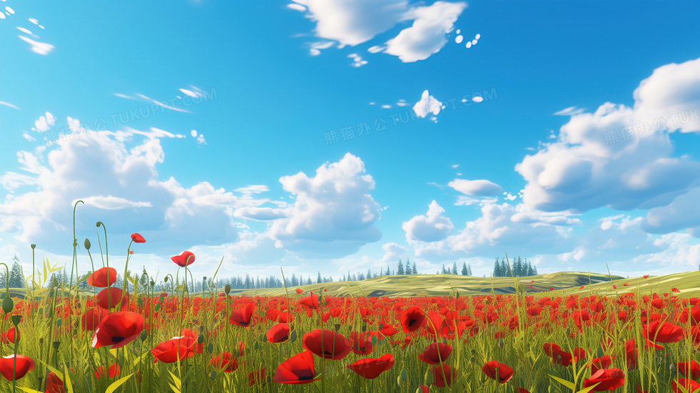 本作品内容为夏日蓝天下的红色花海插画, 格式为 jpg, 大小3 MB, 图片尺寸为2912 x 1632, 源文件无水印, 欢迎使用熊猫办公。 如认为平台内容涉嫌侵权,可通过邮件:tousu@tukuppt.com提出书面通知,我们将及时处理。