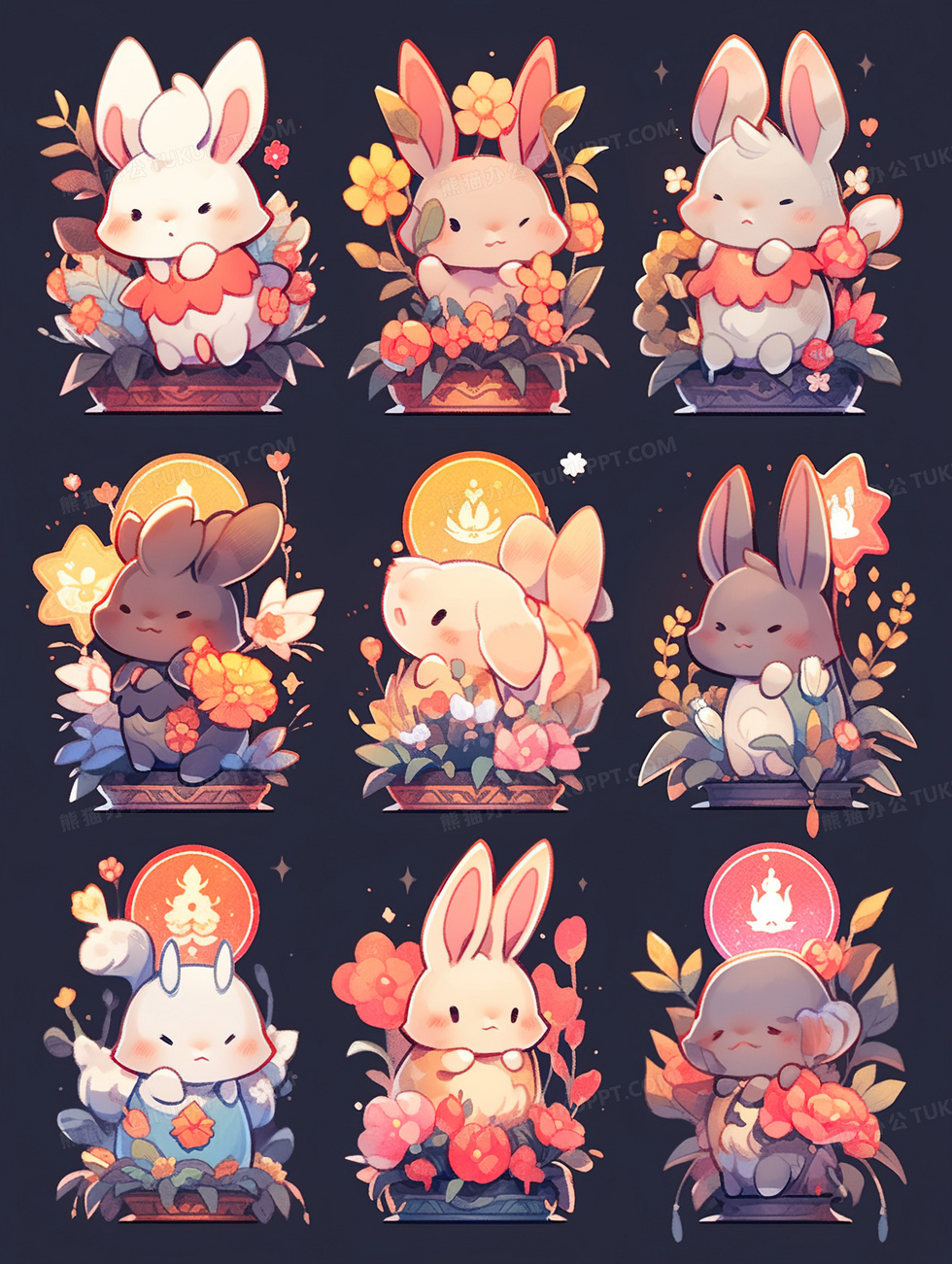 本作品内容为九宫格中国风花朵小白兔可爱卡通插画, 格式为 jpg, 大小6 MB, 图片尺寸为1856 x 2464, 源文件无水印, 欢迎使用熊猫办公。 如认为平台内容涉嫌侵权,可通过邮件:tousu@tukuppt.com提出书面通知,我们将及时处理。