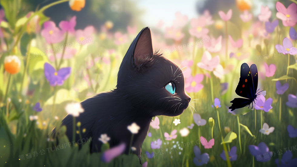 本作品内容为可爱的小猫在花丛中被蝴蝶吸引创意插画, 格式为 jpg, 大小5 MB, 图片尺寸为2912 x 1632, 源文件无水印, 欢迎使用熊猫办公。 如认为平台内容涉嫌侵权,可通过邮件:tousu@tukuppt.com提出书面通知,我们将及时处理。