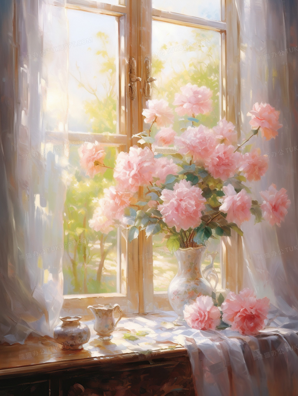 本作品内容为粉色系窗边花瓶花朵花卉油画静物插画, 格式为 jpg, 大小7 MB, 图片尺寸为1856 x 2464, 源文件无水印, 欢迎使用熊猫办公。 如认为平台内容涉嫌侵权,可通过邮件:tousu@tukuppt.com提出书面通知,我们将及时处理。