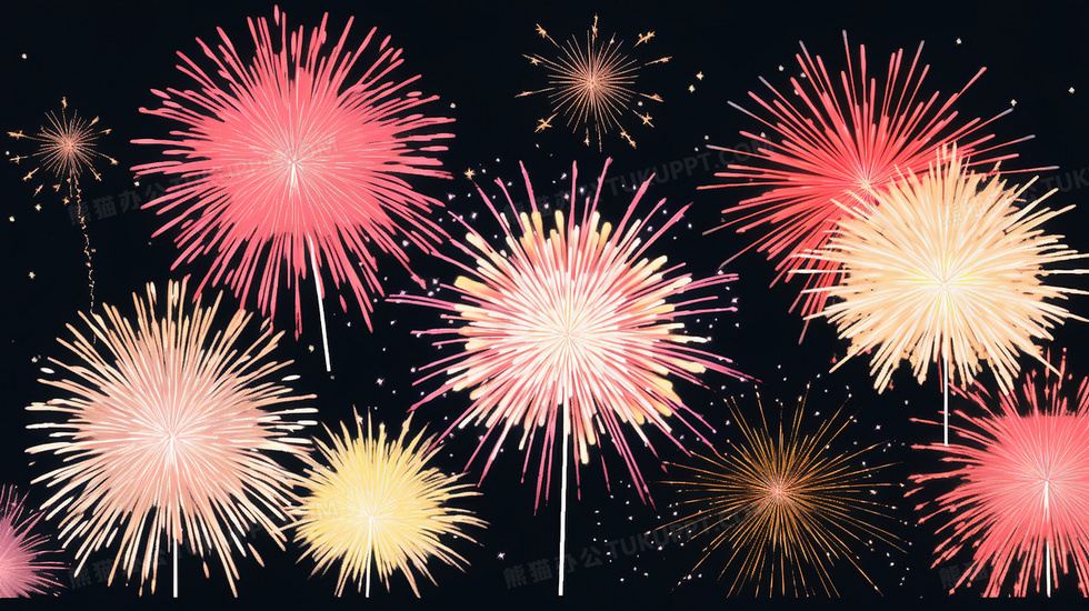 本作品内容为璀璨的节日烟花表演插画, 格式为 jpg, 大小7 MB, 图片尺寸为2912 x 1632, 源文件无水印, 欢迎使用熊猫办公。 如认为平台内容涉嫌侵权,可通过邮件:tousu@tukuppt.com提出书面通知,我们将及时处理。