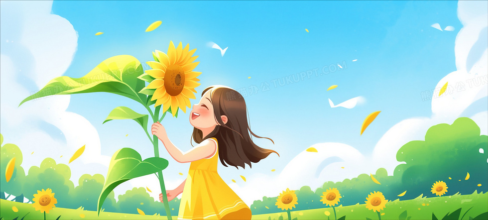 本作品内容为开心的小女孩手拿向日葵插画图片, 格式为 jpg, 大小2 MB, 图片尺寸为2904 x 1310, 源文件无水印, 欢迎使用熊猫办公。 如认为平台内容涉嫌侵权,可通过邮件:tousu@tukuppt.com提出书面通知,我们将及时处理。