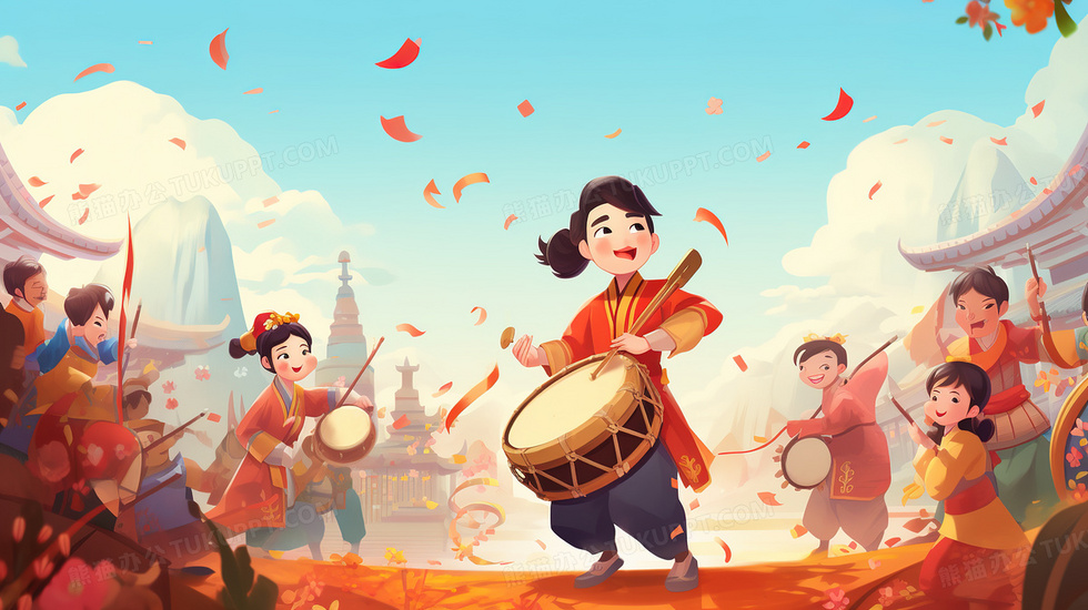 本作品内容为春节假期里一起敲鼓玩耍的孩子们插画, 格式为 jpg, 大小5 MB, 图片尺寸为2912 x 1632, 源文件无水印, 欢迎使用熊猫办公。 如认为平台内容涉嫌侵权,可通过邮件:tousu@tukuppt.com提出书面通知,我们将及时处理。