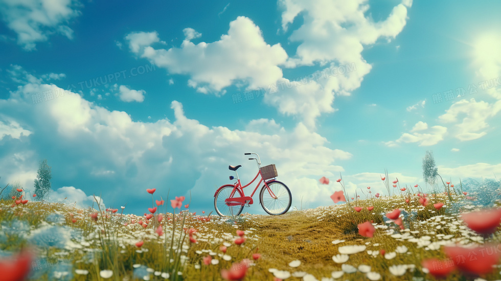 本作品内容为蓝天白云下的鲜花盛开的草地上的自行车插画, 格式为 jpg, 大小6 MB, 图片尺寸为2912 x 1632, 源文件无水印, 欢迎使用熊猫办公。 如认为平台内容涉嫌侵权,可通过邮件:tousu@tukuppt.com提出书面通知,我们将及时处理。