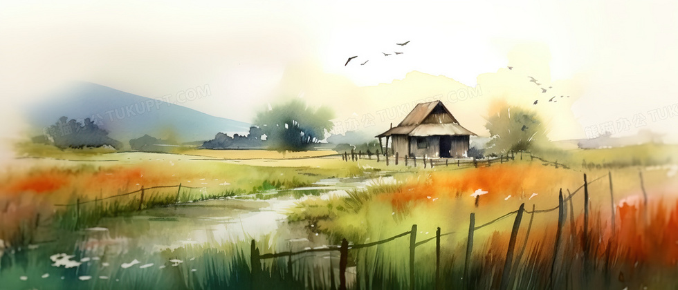 本作品内容为水彩风郊外农庄风景创意插画, 格式为 jpg, 大小5 MB, 图片尺寸为3360 x 1440, 源文件无水印, 欢迎使用熊猫办公。 如认为平台内容涉嫌侵权,可通过邮件:tousu@tukuppt.com提出书面通知,我们将及时处理。