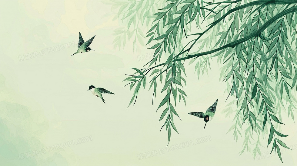 本作品内容为春季绿色中国风柳枝风景插画, 格式为 jpg, 大小3 MB, 图片尺寸为2912 x 1632, 源文件无水印, 欢迎使用熊猫办公。 如认为平台内容涉嫌侵权,可通过邮件:tousu@tukuppt.com提出书面通知,我们将及时处理。