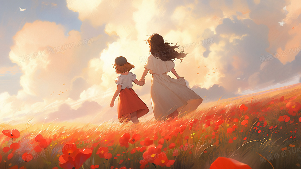 本作品内容为红色鲜花花田里手拉手的女生插画, 格式为 jpg, 大小3 MB, 图片尺寸为2912 x 1632, 源文件无水印, 欢迎使用熊猫办公。 如认为平台内容涉嫌侵权,可通过邮件:tousu@tukuppt.com提出书面通知,我们将及时处理。
