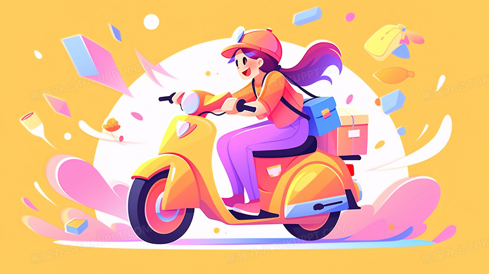 本作品内容为骑着摩托车的送货员插画, 格式为 jpg, 大小2 MB, 图片尺寸为2912 x 1632, 源文件无水印, 欢迎使用熊猫办公。 如认为平台内容涉嫌侵权,可通过邮件:tousu@tukuppt.com提出书面通知,我们将及时处理。