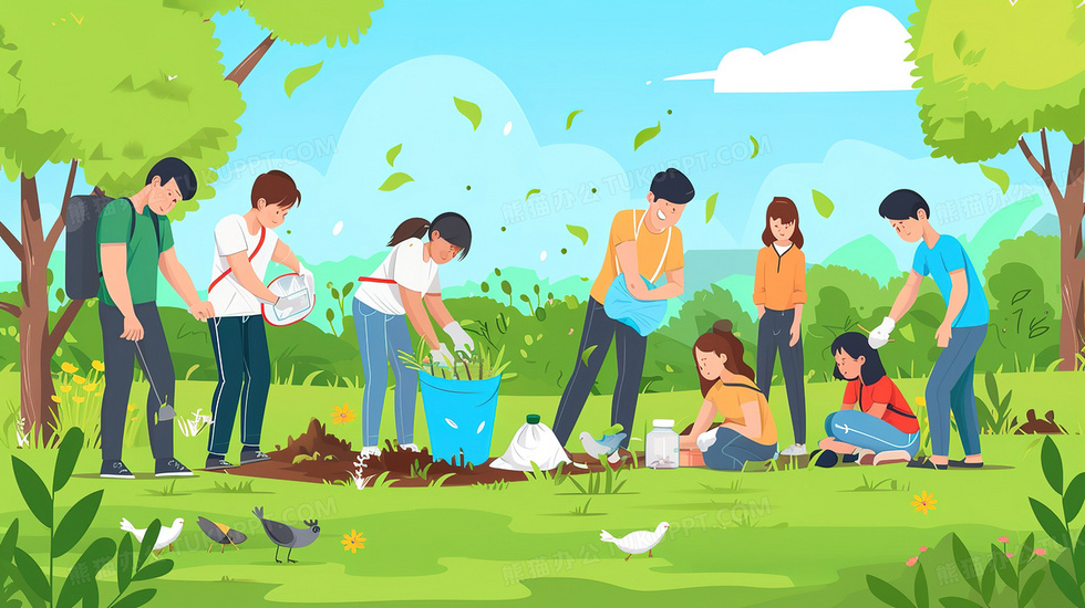 本作品内容为一组人在森林公园里劳动插画, 格式为 jpg, 大小3 MB, 图片尺寸为2912 x 1632, 源文件无水印, 欢迎使用熊猫办公。 如认为平台内容涉嫌侵权,可通过邮件:tousu@tukuppt.com提出书面通知,我们将及时处理。