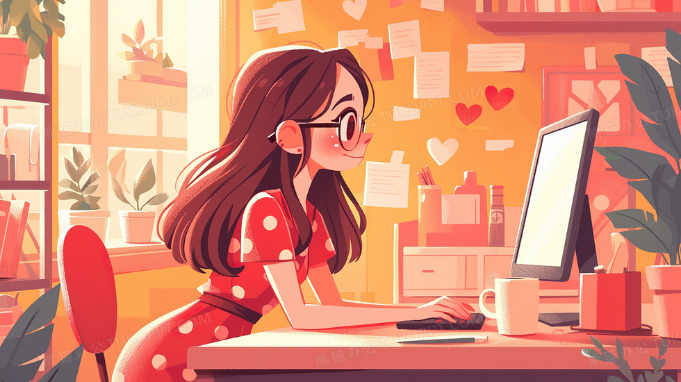 本作品内容为卡通戴眼镜看电脑的女孩插画, 格式为 jpg, 大小3 MB, 图片尺寸为2912 x 1632, 源文件无水印, 欢迎使用熊猫办公。 如认为平台内容涉嫌侵权,可通过邮件:tousu@tukuppt.com提出书面通知,我们将及时处理。