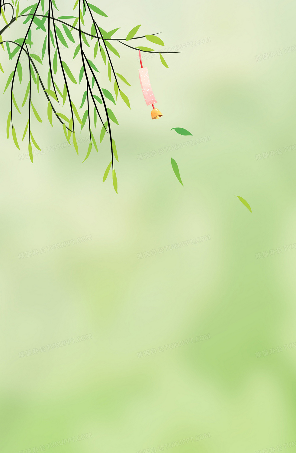 本作品内容为绿色柳树文艺植物风铃背景, 格式为 psd, 大小147 MB, 图片尺寸为3543 x 5413, 作品中背景图片无需修改, 源文件无水印,可以直接使用, 欢迎使用熊猫办公。 如认为平台内容涉嫌侵权,可通过邮件:tousu@tukuppt.com提出书面通知,我们将及时处理。