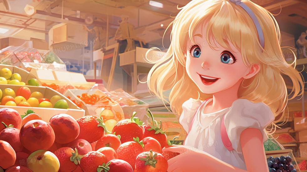本作品内容为一个金发的小女孩快乐地选购水果插画, 格式为 jpg, 大小3 MB, 图片尺寸为2912 x 1632, 源文件无水印, 欢迎使用熊猫办公。 如认为平台内容涉嫌侵权,可通过邮件:tousu@tukuppt.com提出书面通知,我们将及时处理。